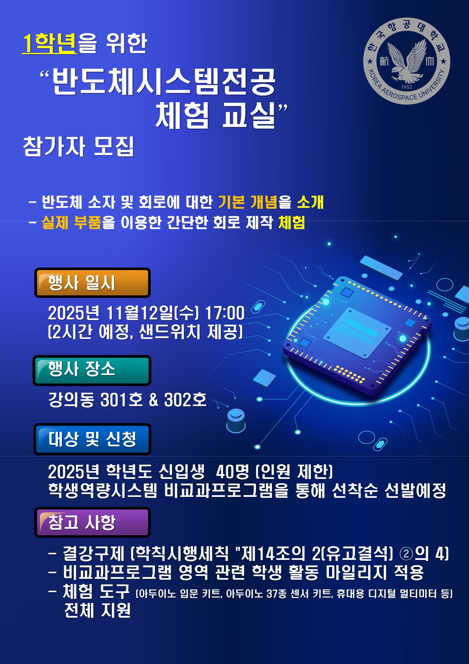 전자및항공전자전공은 미래 산업의 핵심인 항공우주/미래모빌리티/반도체설계및공정/첨단ICT 분야에 진출할창의적인 인재 양성을 목표로 교과과정을 구축하고 있습니다.